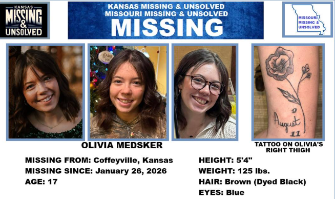 Olivia Medsker was last seen in Coffeyville on Jan. 26. Authorities say the teen may still be in the Coffeyville area, but may also be on the move. Medsker may be traveling to Goodland in western Kansas or possibly to Missouri.