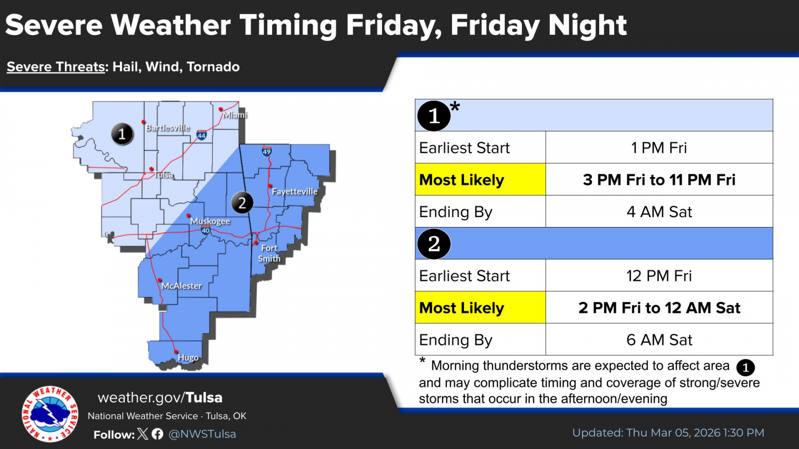 The severe risk during the overnight hours is a Level 1 of 5 from Ramona to the south and east, and a Level 2 from Bartlesville to the north and west. The severe risk increases to a Level 3 for far western Osage and Chautauqua counties.