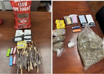 The backpack allegedly contained multiple cellphones, approximately 30 grams of a white crystalline substance believed to be methamphetamine, more than 500 grams of a green, leafy subject of what is believed to be marijuana, cigars, loose tobacco, nicotine vape devices, lighters and other various items.